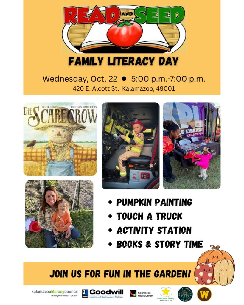 Join us for the last Family Literacy Day of the season! We’ll have pumpkin decorating, story time, free books, and fun activities. It’s also Fire Safety Month, so KDPS will be here with trucks and giveaways. The garden is behind the Goodwill building at 420 E. Alcott St. Hope to see you!