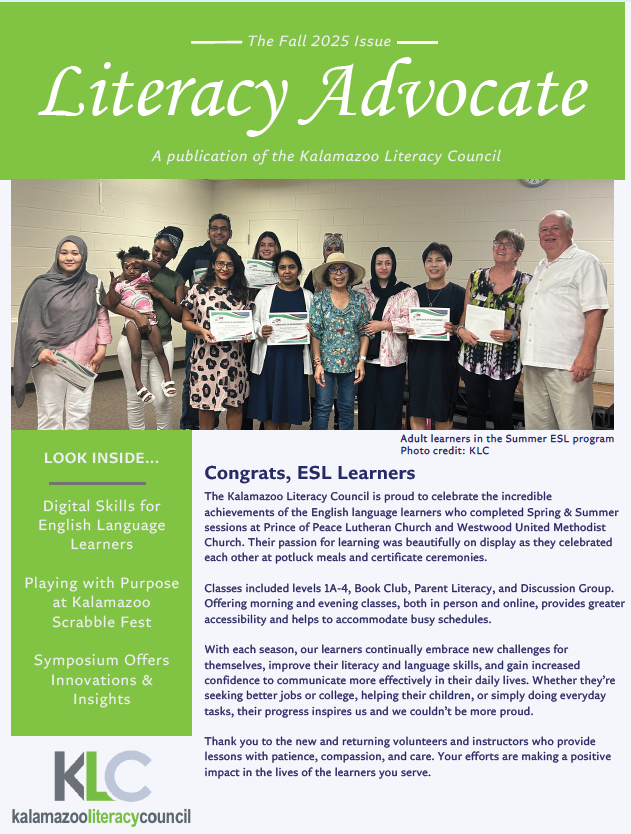 Fall 2025 Newsletter Posted on October 16, 2025 by Kalamazoo Literacy Council - Newsletters Read the latest KLC news! Highlights in this issue include: ESL Summer Program celebrates graduatesĀ Annual symposium offers insights & innovations in adult literacy Playing with purpose at the 14th annual Kalamazoo Scrabble Fest